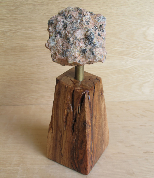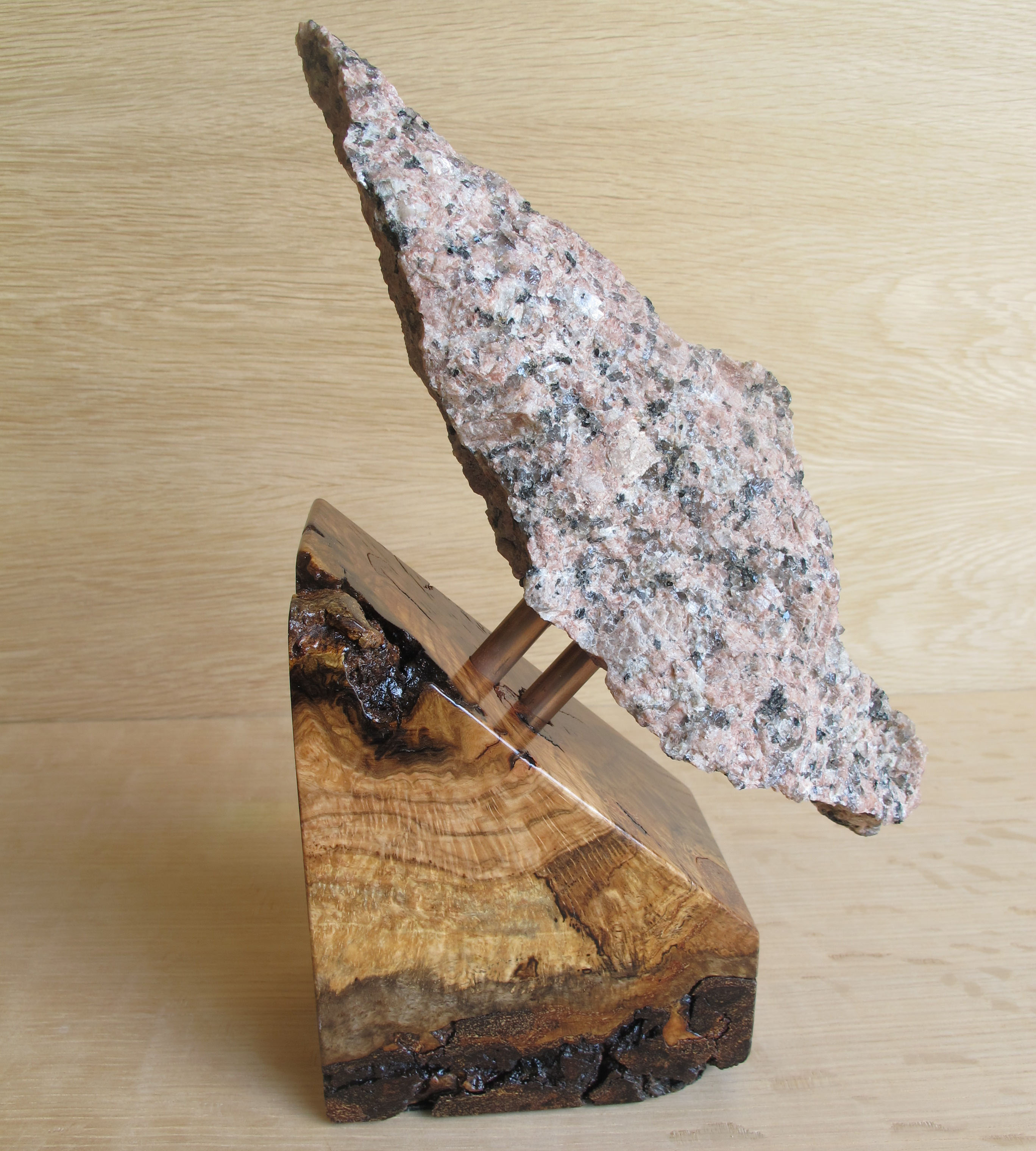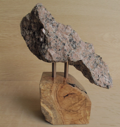 As the granite from the Texas Capitol building develops cracks and water seeps into these cracks and freezes, small pieces of the granite falls off. These pieces are called spalls and the Texas State Preservation Board collects these spalls and was looking for a way to showcase them and offer these pieces for fundraising purposes. As with the earlier Capitol oak pieces, TSPB turned to Mark to create sculptures with several of the more interesting spalls and more of the Capitol oak for bases. The mounted spall pictured here is called “Cardinal” with a copper and red oak burl base. Mark also created “Capitol Idea” with a brass and red oak base. And “Sailfish Flying” sits on a copper and red oak burl base. “Capitol Idea” has already sold even before it had a chance to be displayed.