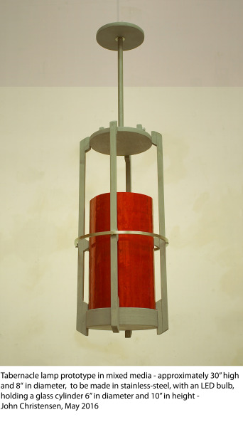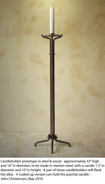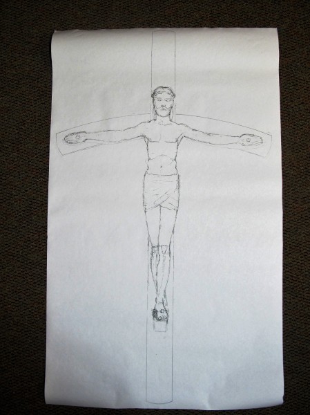 One of the featured elements in the chapel furnishings will be the crucifix (shown in this sketch). Landers will construct the crucifix itself and artist, David Everett, will carve the corpus. The curved crosspiece of the crucifix will reflect the natural-edged curved stretcher of the altar design (maquette shown in featured image above). Landers will build the base of the altar and Kincannon Studios will create the limestone altar top. Landers will also bring in metal artist, John Christensen, to fabricate the candle stands and the tabernacle lamp. Kathleen Ash, Studio K glass artist, will create the stained glass for the chapel doors, the glass of the tabernacle lamp and the baptismal font. Landers also invited another woodworker, Mark Macek, to create some of the furniture.