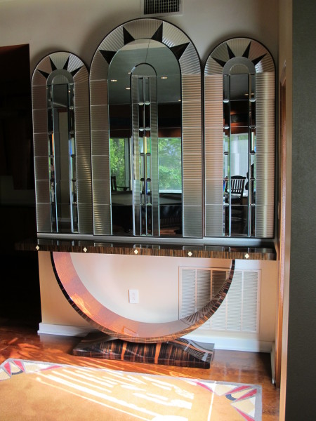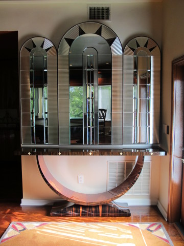 This photo shows the completed arched triptych with the highly beveled mirrored glass and Macassar ebony framework in an Art Deco design reflecting the Chrysler Building in NYC. The design also includes mirror stainless steel in the triangular cut-outs with ebony triangular insets, although the photography does not adequately show this detailing. The table below the arched triptych was not part of this project.