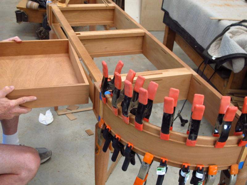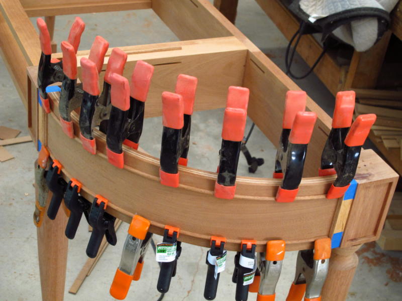 We continue to add the detailing to the mahogany sofa table. We added a cockbeading to the curved sides and to the drawer fronts. The drawers are now fitted to the carcase. In this project, we are not using drawer hardware. The drawers will slide easily wood-on-wood. We have begun the finishing process with a natural oil conditioner that deepens and richens the natural mahogany wood color. After this oil dries for 24 hours, we will begin the spray lacquer process for a hand-rubbed finish.