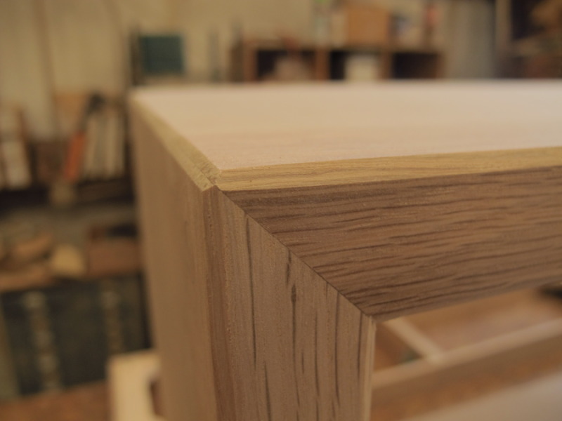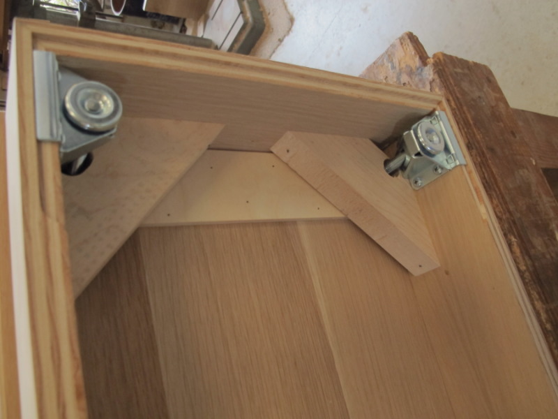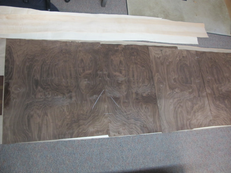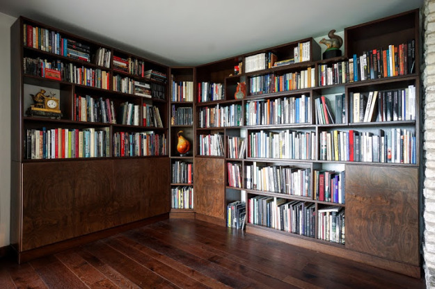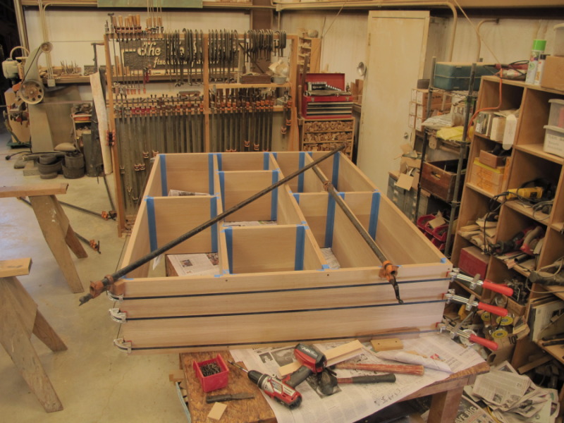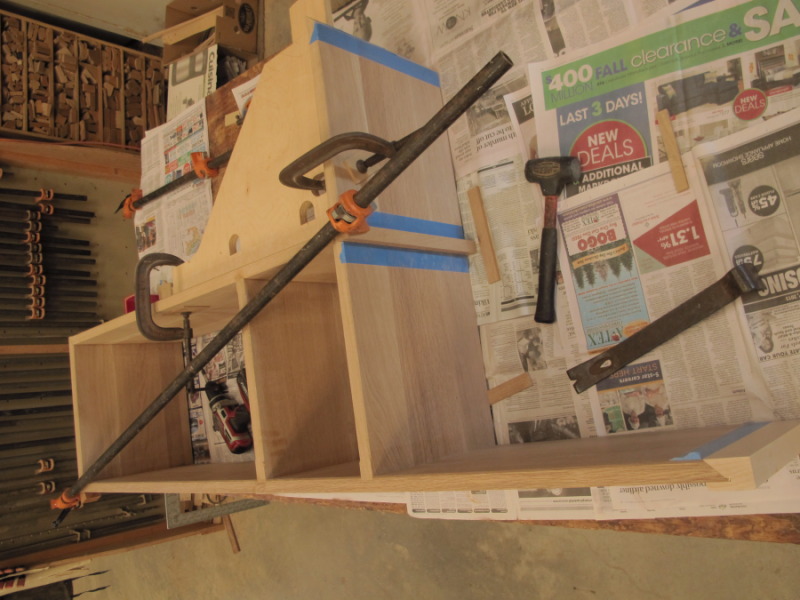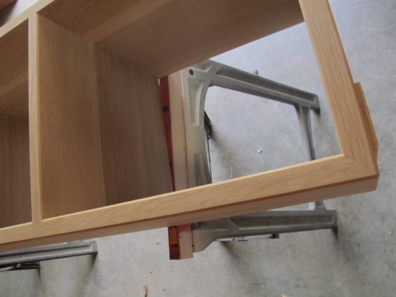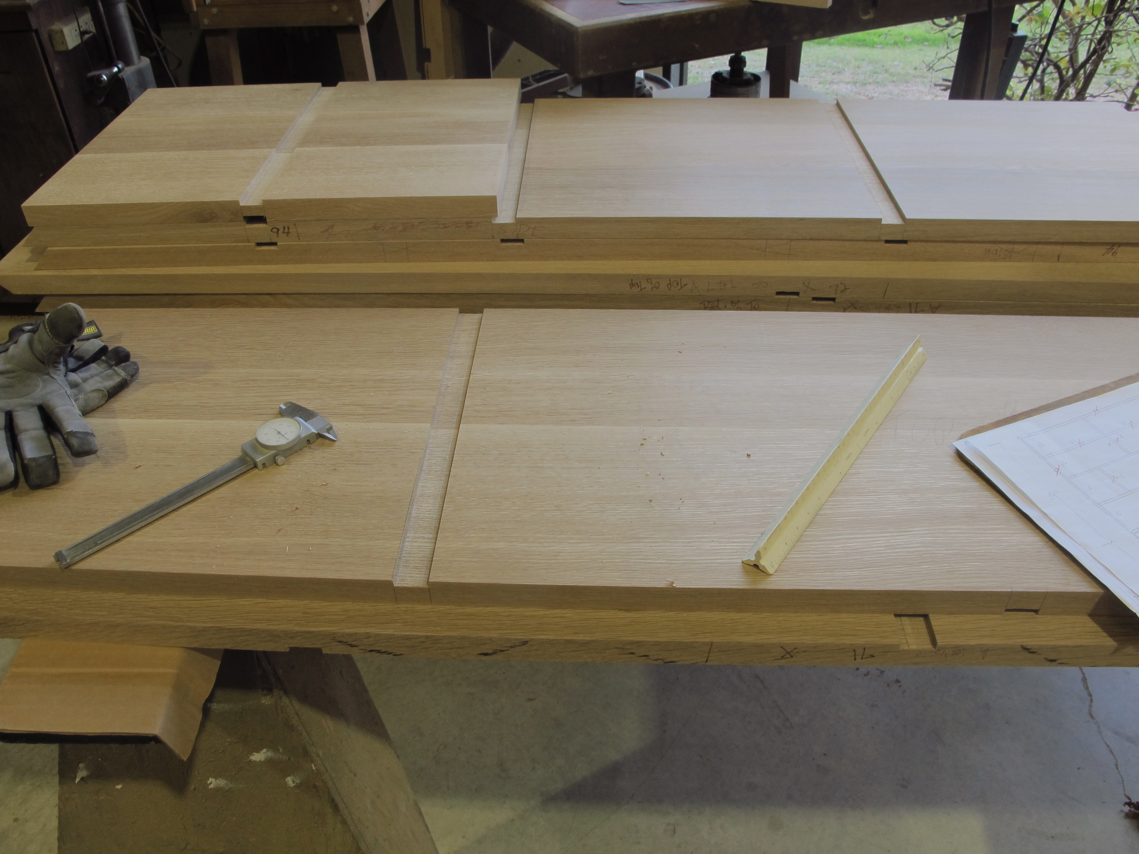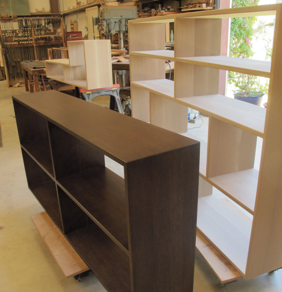 I had to forego my blogging entries about the progress of these library shelves as I became too involved in the sanding, glue-ups, sanding again, staining and finishing to have any time left over to write about it. Now with the shelving units installed, I can look back at our documentation and retrace the process from where we left off in the last blog. The last entry showed the oak sized for the various components of the shelves. Next Mark laid out the dadoes for the units. The glue-ups were complex especially in clamping up all the components without losing square. The largest unit proved to be a very challenging glue-up. But ultimately the mitered joints came together and shelves pulled up in the dadoes. The cabinets were then given a beveled edge treatment as a finishing touch. A leveler system was also installed to compensate for the uneven floors. Several of the lower cabinets were going to have doors with a walnut burl veneer. Much time was spent by Mark and our client coming up with the best veneer matches for these doors. For such a large project, the finishing had to be done in stages with finished cabinets moving next to unfinished cabinets waiting to be stained and then lacquer finished. The client finally has his boxes of books off the floor and into his new shelves with his art pieces showcased.